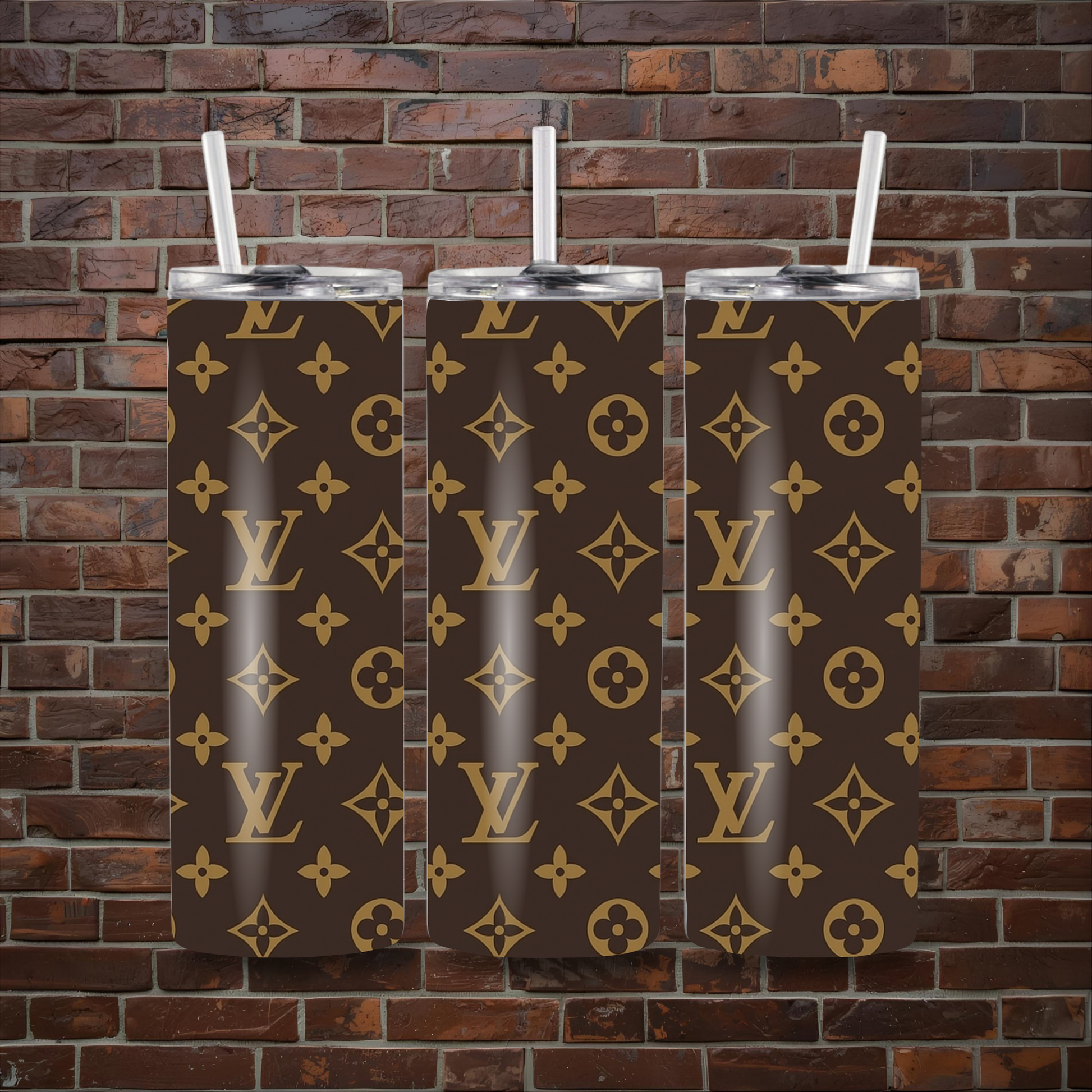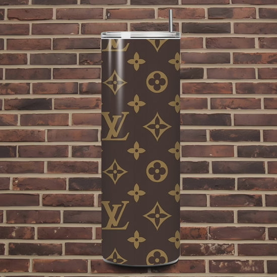 “20oz stainless steel tumbler with straw, featuring a luxury-inspired brown and gold monogram design. Perfect for keeping drinks hot or cold in style.”